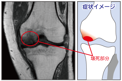 ひざ関節に接している大腿骨の先端の組織が壊死する病気です。中高年以降の女性に多く見られ、エックス線やMRI検査をして壊死した部位を確認することができます。壊死した組織がつぶれると痛みが増し、特に夜間や安静時に強い痛みを感じることがあります。