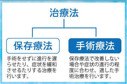 手術療法は、保存療法で効果が得られない場合に選択されます。術後は適切なリハビリを行いながら回復を待ち、退院時には自分で歩いて帰る場合がほとんどです。