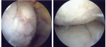 関節の周囲(皮膚面)に2~3箇所の小さな穴を開けます。その後関節に光ファイバーと小さな高性能カメラで構成された内視鏡を挿入して損傷部位を修復したり、不要な遊離体や損傷組織を摘出除去します。変性した半月板や軟骨、増生した滑膜や骨棘の処理も行います。