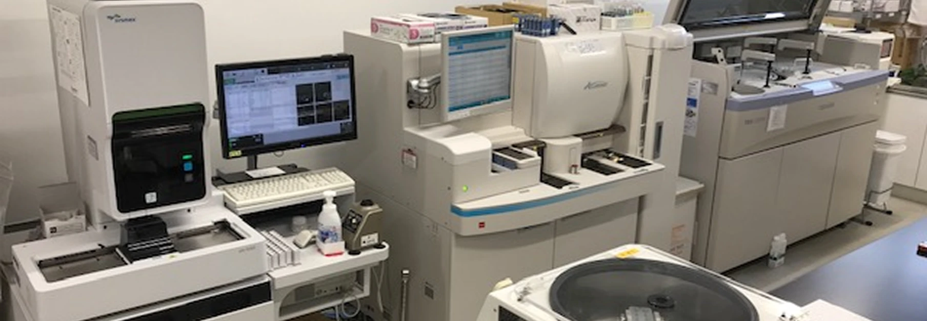 赤血球、白血球、血小板、ヘモグロビンなどの検査です。自動血球計数器で測定します。